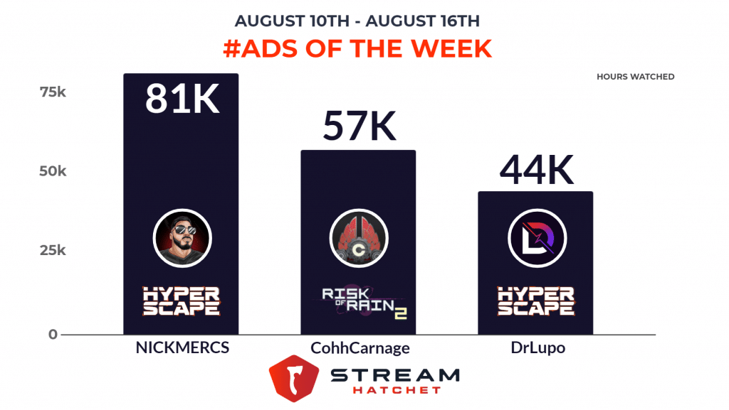 TL;DR: Sponsored segments of Hyper Scape and Risk of Rain 2 were the top #ads last week with some help from NICKMERCS, CohhCarnage, and DrLupo.