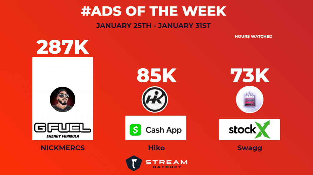 Streamers signed to esports organizations dominated the latest #Ads of the Week. FaZe Clan members NICKMERCS and Swagg combined for 360K hours watched across two sponsored segments and 100 Thieves VALORANT player Hiko produced 85K hours watched. NICKMERCS’ partnership with G FUEL proves to be successful yet again and cementing the pair as one of the most prolific duos in sponsored content on stream. Hiko’s segment with Cash App is aligned with 100 Thieves’ larger partnership with the mobile payment service; even the esports organization’s headquarters is named the 100 Thieves Cash App Compound. Clearly, the relationship between the 100 Thieves ecosystem and Cash App is providing extensive reach and viewership. Lastly, Swagg worked with StockX, an online marketplace largely known for buying, trading, and selling sneakers and retail merchandise. The company teamed with Swagg for a $500 giveaway to be used on their site incentivizing viewers to tune in to the promoted stream.
