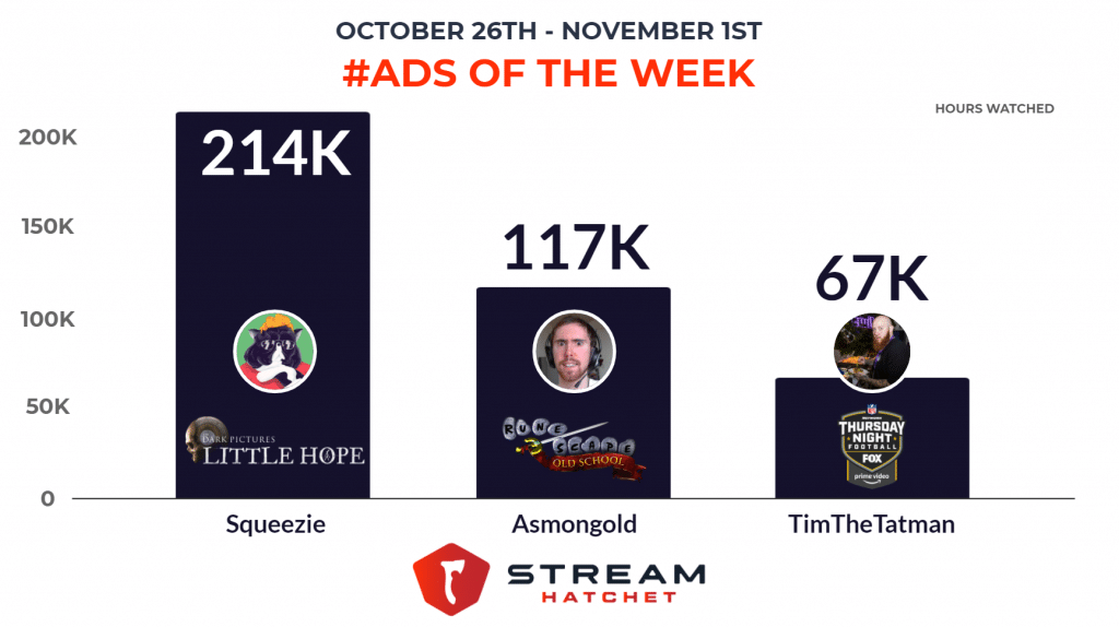 French musician and streamer Squeezie came out on top last week for the #ad with the most hours watched. He had a 6 hour session playing Little Hope, the newest interactive story game from Bandai Namco. The segment was a playthrough to generate awareness for the game while showcasing the unique features of choosing the path of the story. Asmongold finished in second after joining the Old School RuneScape developers for a sponsored stream. It was Asmongold’s first time playing OSRS which caught of lot of people’s interest to see his first reaction to the popular MMO RPG. Lastly, TimTheTatman streamed another Thursday Night Football between the Falcons and Panthers. It’s likely this sponsored stream would have done better if the two teams playing were in better standings in the NFL but it still did enough to earn third place last week.