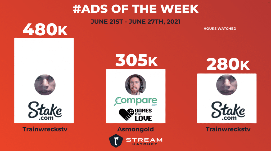 The latest #Ads of the Week features returning Stake.com partner Trainwreckstv securing two of the three #ads spots. Popular World of Warcraft streamer and One True King (OTK) co-founder Asmongold and sponsor Compare.com secured the second spot with Games for Love charity stream. Games for Love is a nonprofit dedicated to creating a sustainable financial future for children who are suffering from life-threatening conditions. The event was made possible by Softgiving, an event organizer who brought Asmongold, Games For Love, and Compare.com together and orchestrated the activation. The two-day charity stream raised over $600,000. Asmongold’s channel kicked off the stream and raised $382,413. Additionally, OTK member Mizkif ended the stream with an auction event where viewers could bid on items like OTK posters and Pokemon cards.