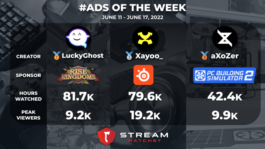 Xayoo_ took second place with his sponsored stream from Steelseries. Xayoo_, who is a Polish speaking streamer, had 79.6k hours watched and the highest peak audience for this week with 19.2k viewers. Steelseries sent Xayoo_ a case that contained their new Arctis Pro Nova wireless headset that was just released.