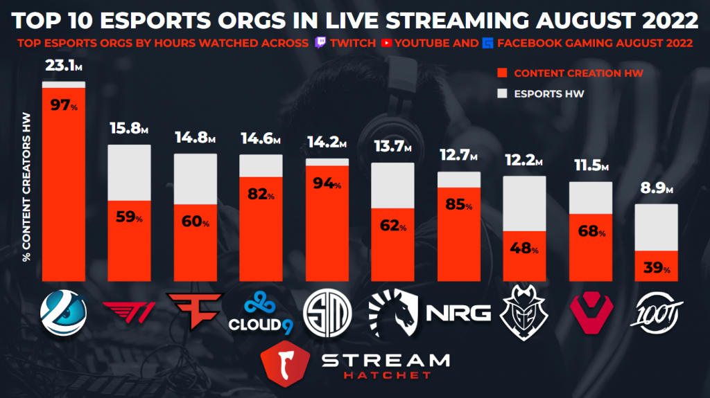 The remaining five (5) teams on this month’s leaderboard all saw their content creators generate more than 60% of their organization’s total monthly viewership. Each of these 5 orgs are filled with talented creators, but were led at the top by: FaZe Clan– NickMercs (5.1M), TSM– TSM_ImperialHal (2.2M), Cloud 9– Forsen (1.8M), NRG– Aceu (1.5M), and Team Liquid– Mendo (1.2M).