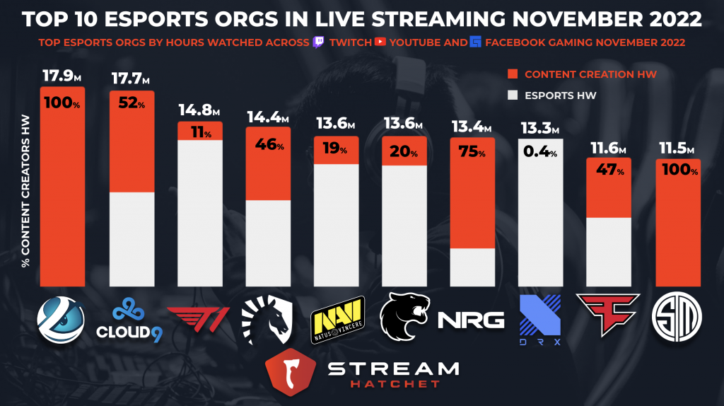 FaZe Clan made it to the top 10 esports organizations list this month with 11.6M hours watched, almost evenly split between their esports team and content creator viewership. The team netted 6.2M hours watched during their esports appearances in the Intel Extreme Masters, the BLAST Premier Fall Finals, and several other tournaments. Nickmercs had the team’s highest content creator viewership at 2.5 million hours watched in November.
