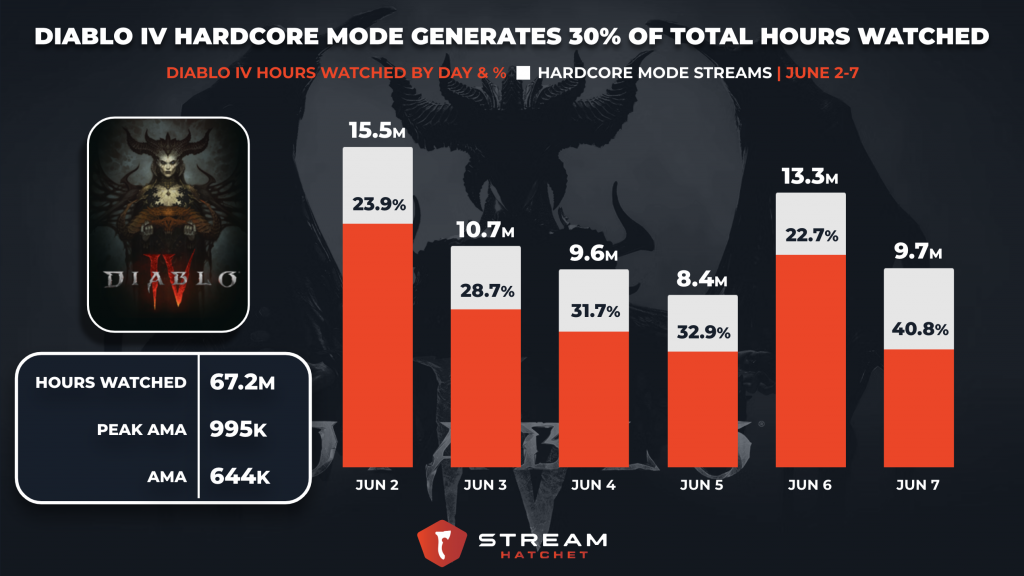 From June 2nd to June 7th, Diablo IV generated 67.2M hours watched across live streaming platforms and reached a peak viewership of 995K viewers the day early access was released. In the same timeframe, Diablo IV maintained an average viewership of 644K viewers.