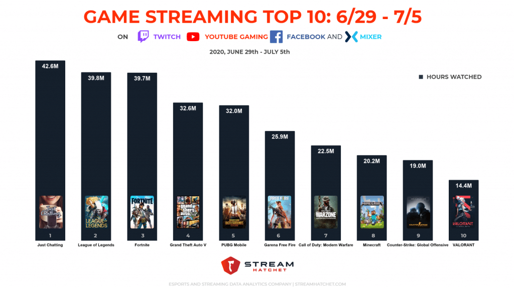 TL;DR: Just Chatting led all categories, Dota 2 drops out of the top ten, and VALORANT climbs back onto the list.