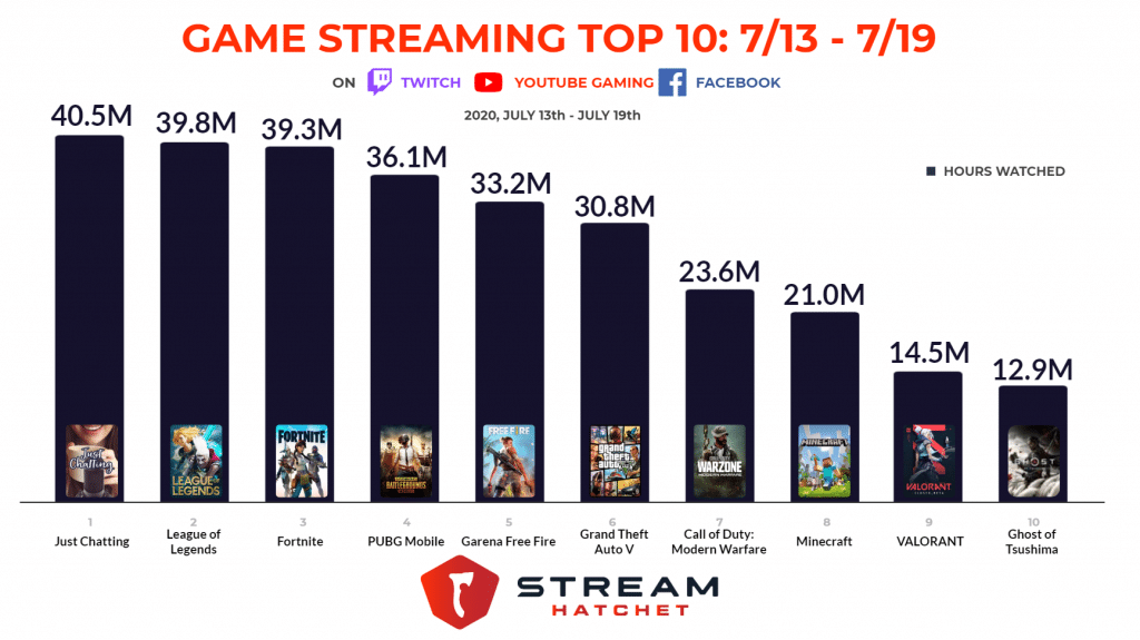 TL;DR: Just Chatting, League of Legends, and Fortnite remain at the top and the Ghost of Tsushima release drew sizable viewership.