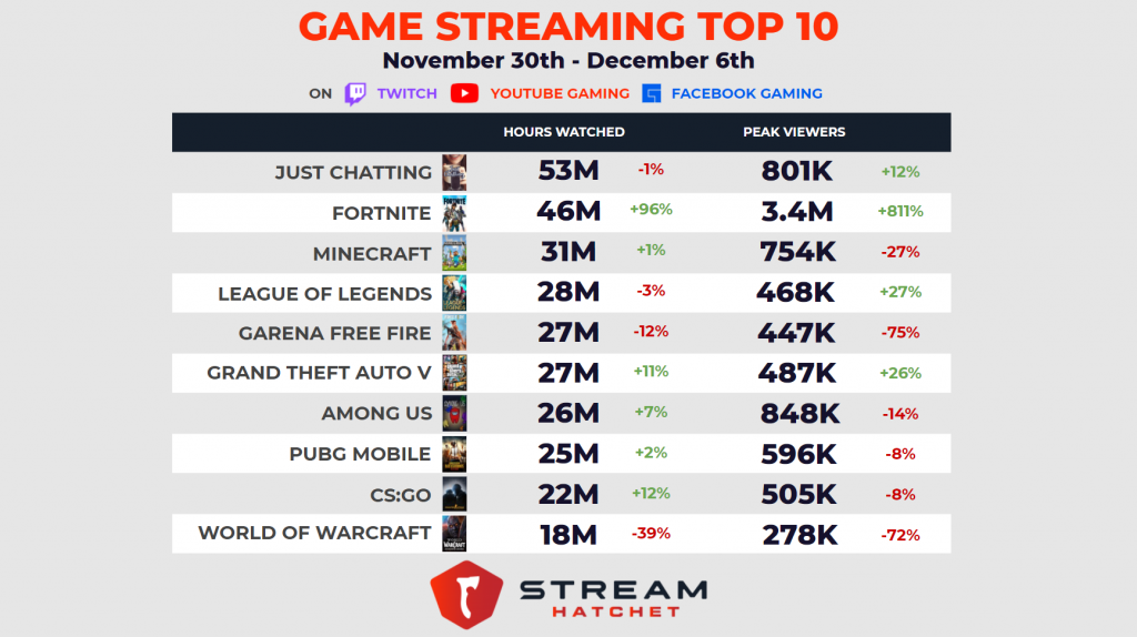 - Fortnite skyrocketed 96% in total hours watched to reach 46M thanks to the Galactus in-game event. The game also reached 3.4M peak viewers!