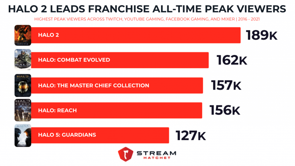 Expectations were high after the massive success of Halo: Combat Evolved. Released in 2002, Halo 2 continued building the Series’ legacy and presently leads the franchise with 189K peak viewers. The game’s online multiplayer was a first for Halo and played a major role in the popularity of the game. Furthermore, the success of the game mode helped put Xbox Live, Microsoft’s online service for gaming now called Xbox network, on the map.