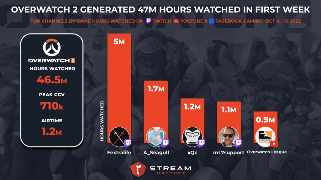 Overwatch 2 launched on October 4th for PC and all major consoles 3 years after its initial reveal at Blizzcon 2019. In the first week of its release, Overwatch 2 garnered 46.5 million hours watched on major live streaming platforms and saw 710K viewers at its peak.