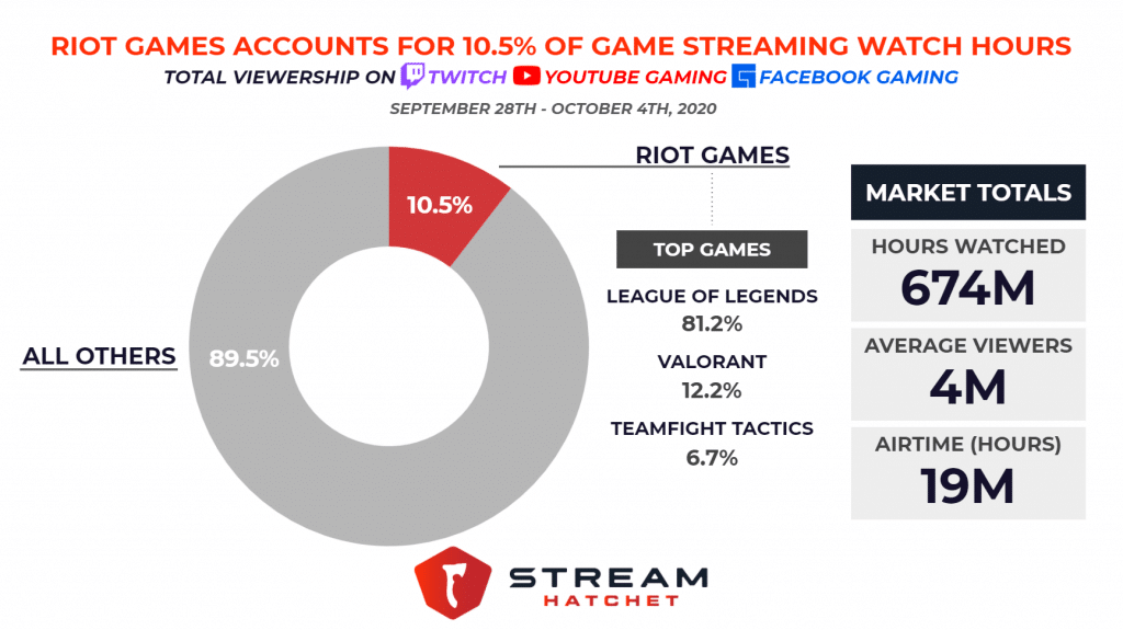 - League of Legends accounted for the majority of the Riot Games viewership with 81.2% of its total hours watched.