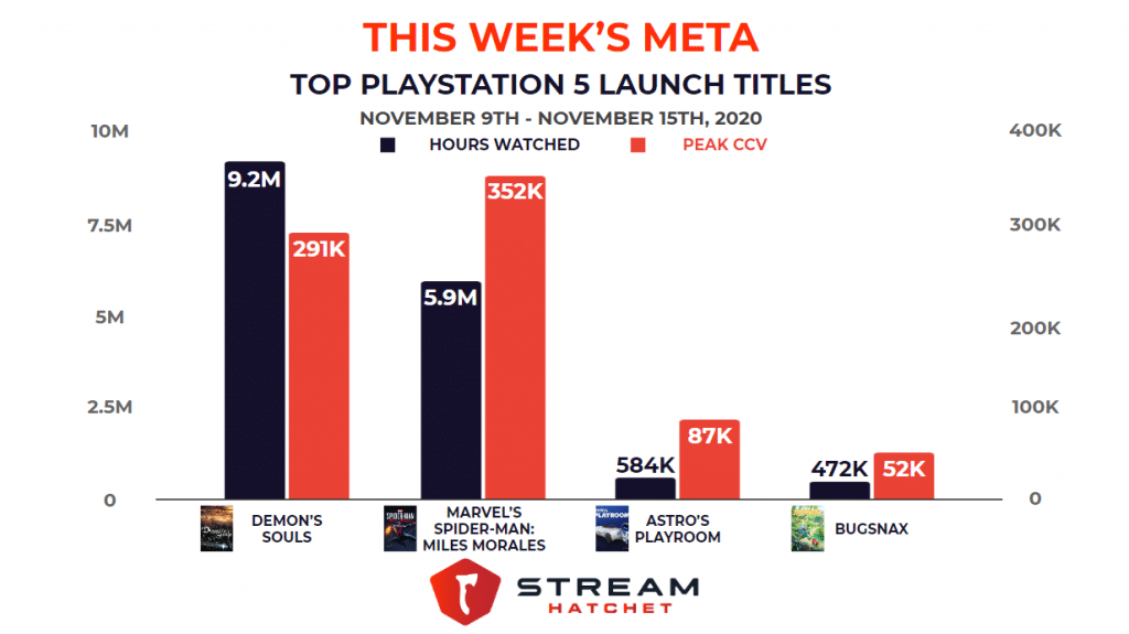 With the release of the PlayStation 5, there was plenty of hype around the console exclusive titles. Upon launch of the PS5, Demon’s Souls and Marvel’s Spider-Man: Miles Morales became clear favorites and had generated peaks of 290K and 352K, respectively. Combined, the two games reached over 15M hours watched within the first week of PS5’s lifecycle. Although Demon’s Soul and the latest Spider-Man game were the most popular, Astro’s Playroom and Bugsnax produced a decent amount of viewership as well – totaling over 1M hours watched. As more titles are released for the PlayStation 5, expect a few titles to reach massive viewership from all the playthroughs on streaming platforms.