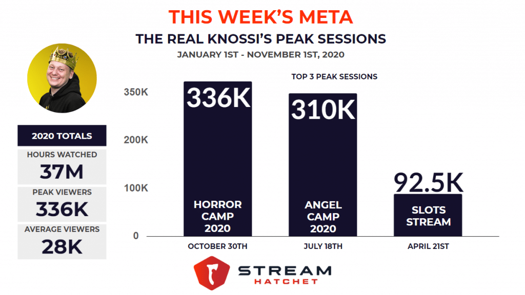 - TheRealKnossi generated a peak of 336K viewers during the Horror Camp stream and has reached over 37M hours watched in 2020.