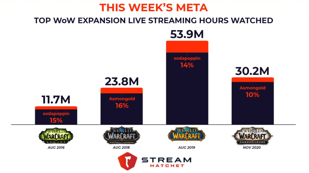 - Asmongold generated the most Shadowlands hours watched with about 3M hours, or 10%, of the total viewership.